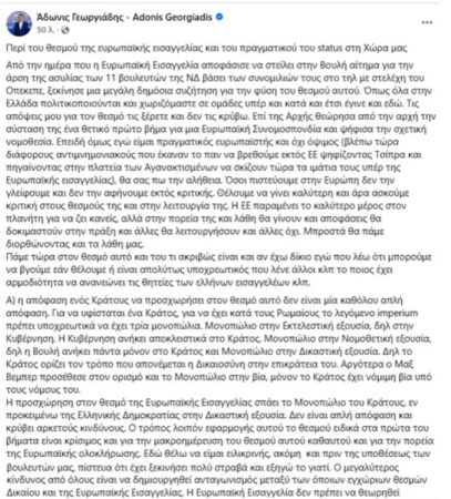 - Europe is not supra criticism → Adonis Georgiadis declares himself pro-European, but rejects unsighted acceptance of institutions.
